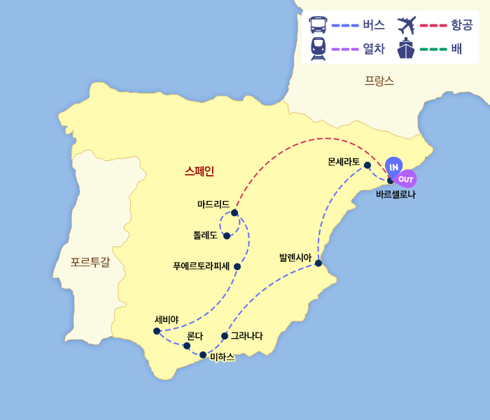 인천-바르셀로나(1)-마드리드-톨레도-마드리드(1)-푸에르토라피세-세비야(1)-론다-미하스-그라나다(1)-발렌시아(1)-몬세라트-바르셀로나(2)-기내박(1)-인천