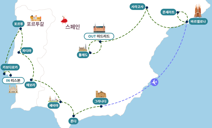 인천-마드리드(1)-톨레도-마드리드(1)-사라고사-바르셀로나(1)-몬세라트-바르셀로나(1)-항공이동-그라나다(1)-론다-세비야(1)-에보라-파티마(1)-포르투(1)-카보다로카-리스본-기내(1)-인천